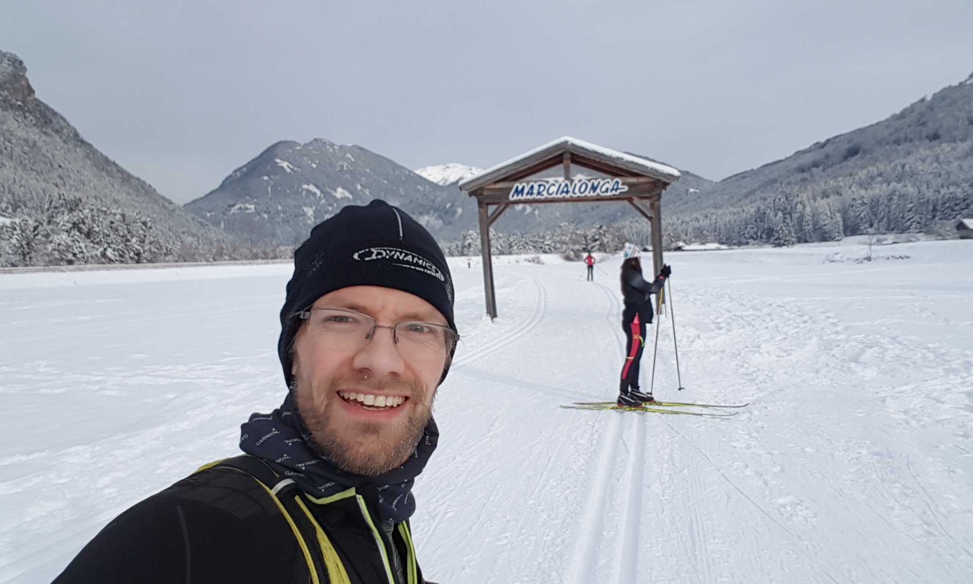 The Marcialonga is an easy route. The track runs up the valley next to the small river that winds through it. While it’s always going up, the incline is very modest. In Summer, it’s a family-friendly bike path. From Molina di Fiemme, it’s 8km to the Lago di Tesoro arena. That’s where the valley’s cross-country World Cup takes place. (The Tour de Ski traditionally ends in this arena.) The tracks for the pros are sometimes prepared as well. Then, it’s another 8km to Predazzo. Those are a tiny bit more challenging at first, then not. At Predazzo, turned around. The way back followed the exact same route. I personally don’t like that very much. I prefer meaningful loops. That’s not easy in a valley with some population and other infrastructure.