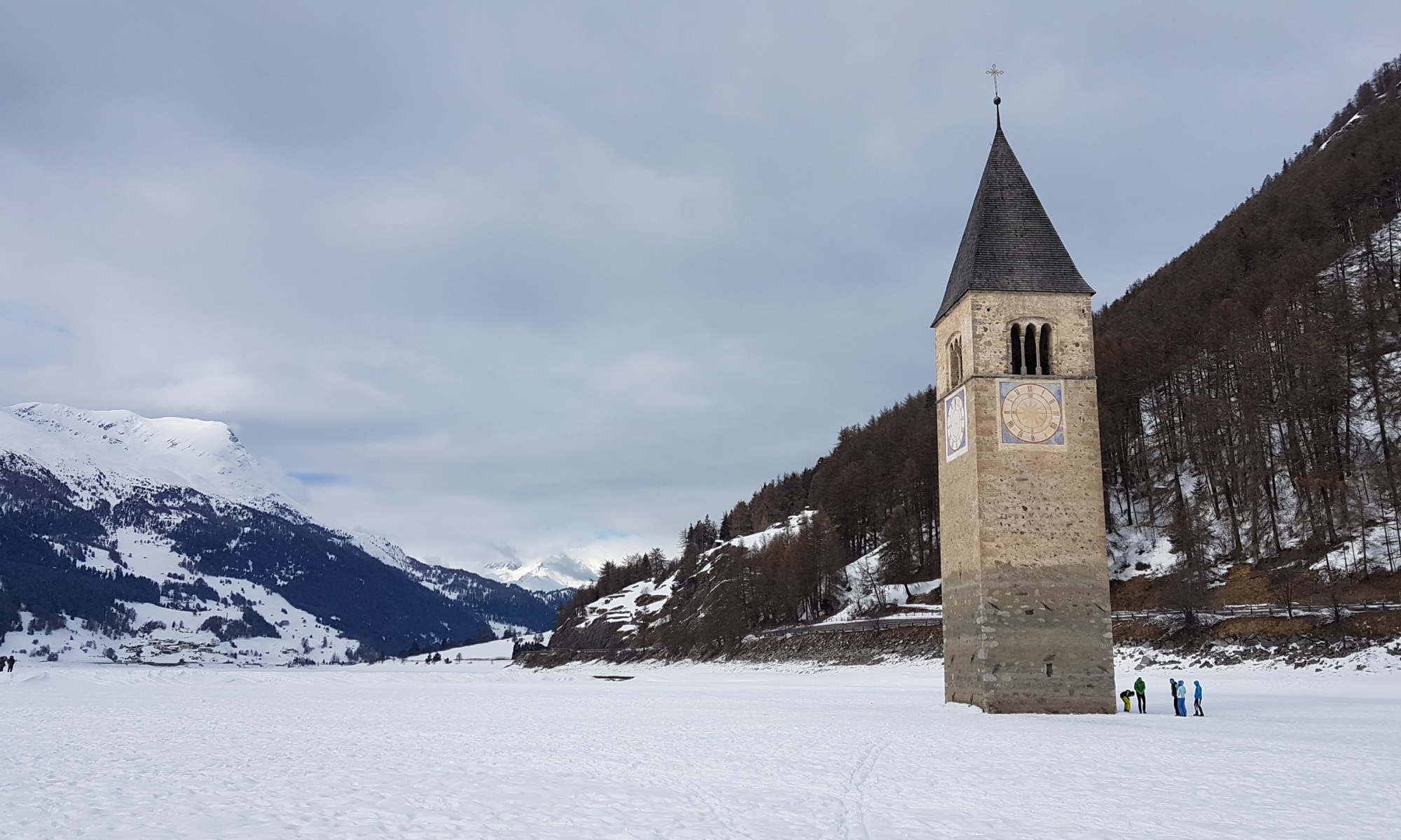The Western end of Südtirol is less famous than the Dolomites maybe. It’s the home of the Stelvio, but it also hosts the second-lowest route to cross the Central Alps. On top of that pass, at 1,500m elevation, is now an artificial lake. For the construction of said lake, they moved a village a few hundred meters up the mountain. They didn’t demolish all of the existing village. To this date, visitors can see the church tower. And in winter, the lake freezes. The church tower becomes accessible again.