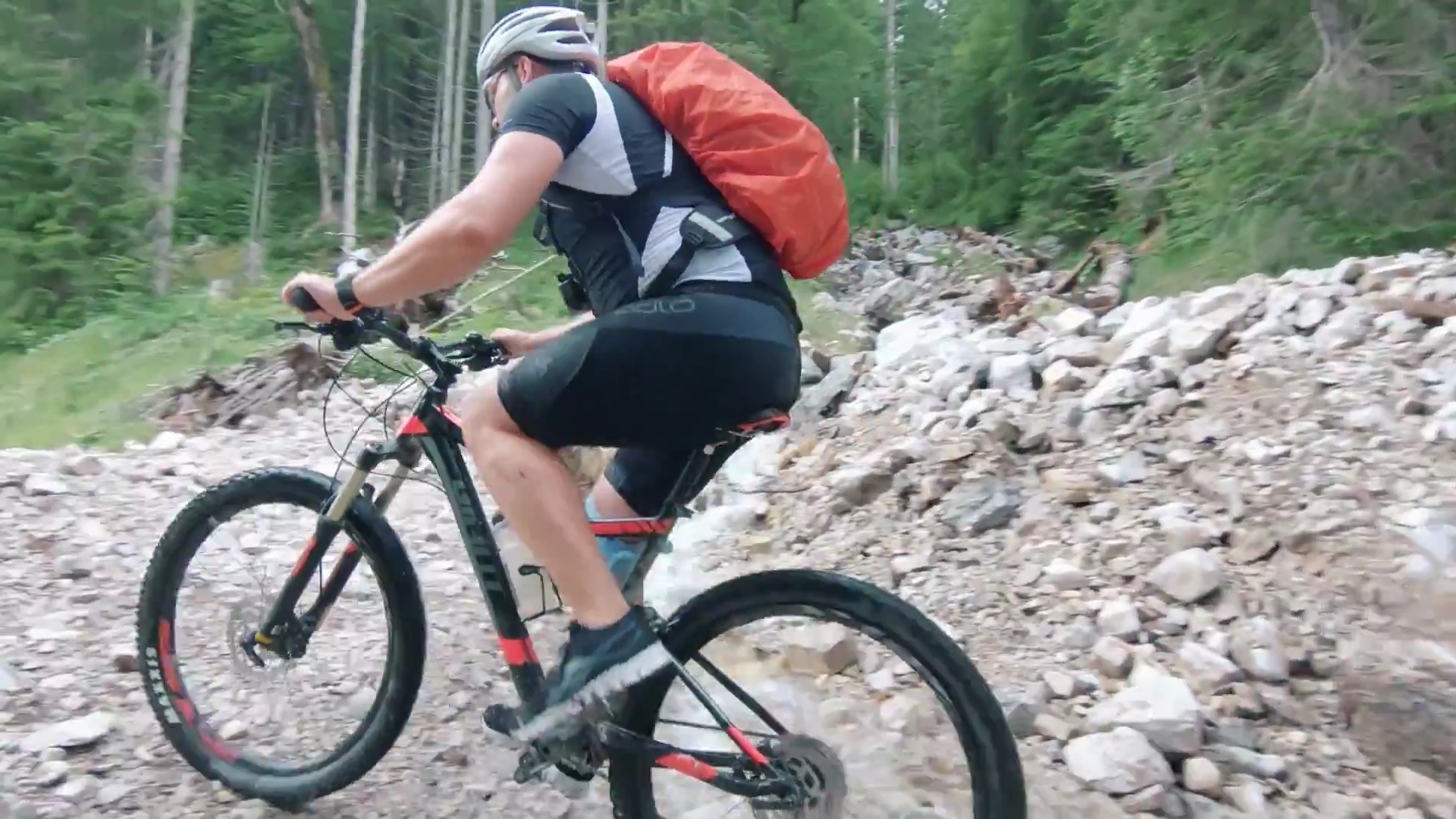 He injured himself on the knee. He slid off a root and fell with his knee in a stone. He had a small cut, but could continue to ride. To stop the blood, I had wrapped my tiny microfiber towel around his knee. (We had thought about swimming after the ride.) On top of the mountain, 2.5km later, we coincidentally met some people with a car (and, hence, a first aid set). Among them was a doctor who took care of a second and much improved first aid. Later they stitched it in the emergency room of a hospital in Munich (we had to wait five hours on a quiet evening…) and now he is recovering.