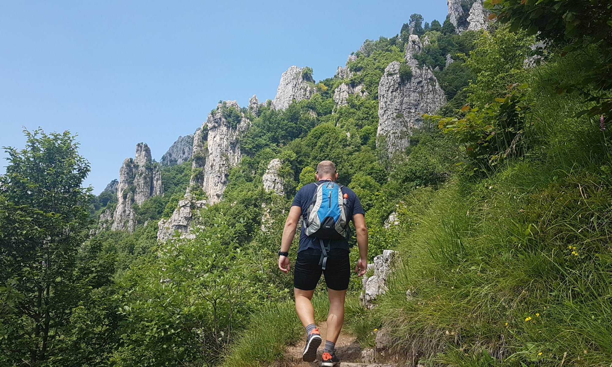 At some point, the trees disappear. This changes the character of the hike from something not very unusual to something special. Richly green grass wraps around the Dolomite stones, while steep below the blue of Lago di Como sparkles in the sun. At good sight, Milan sends a greeting from the plains and the mountains of Switzerland appear. Like many peaks at Lago di Como, the long views into the distance are amazing. Provided it’s not one of these humid days. Then, it’s still beautiful.