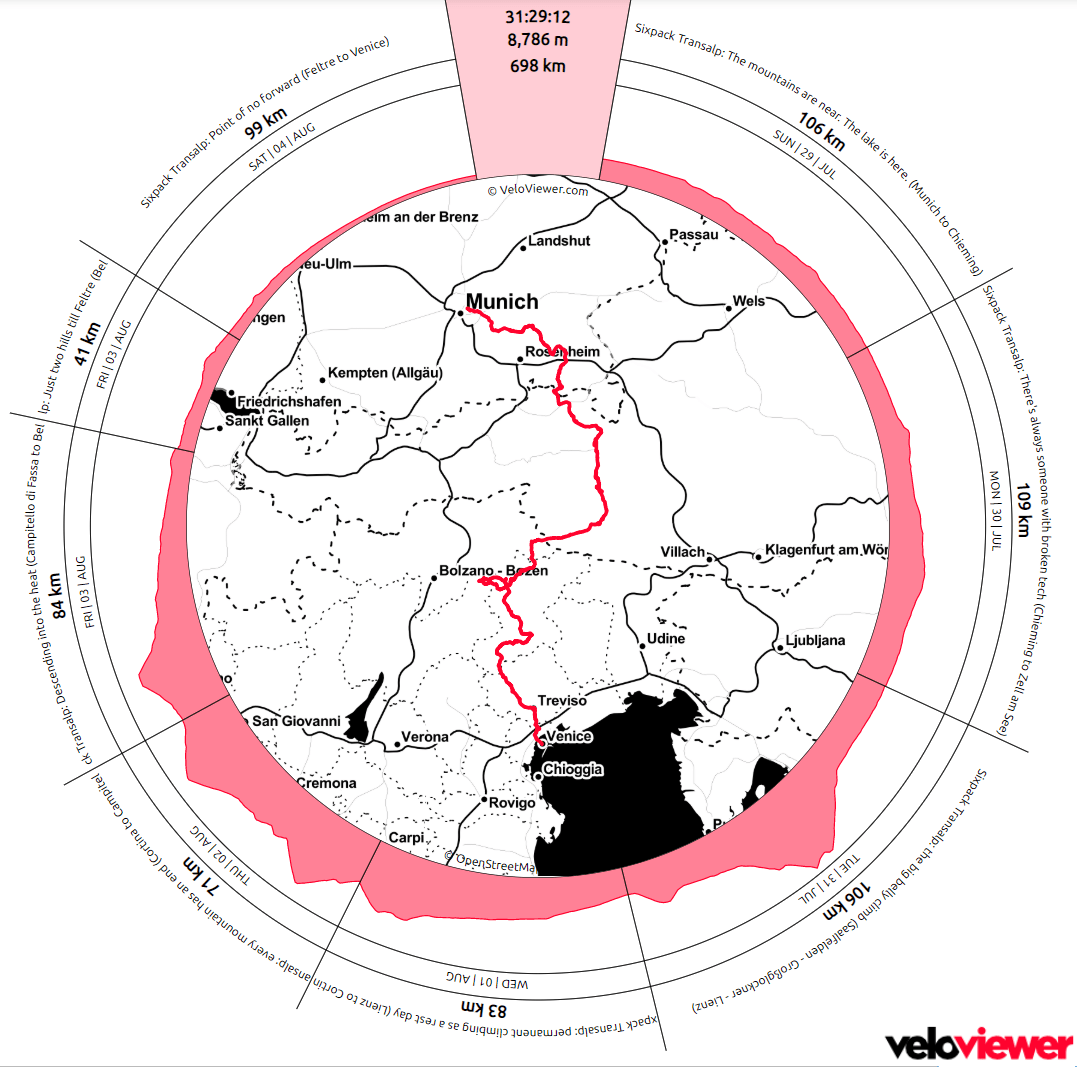 Almost exactly one month ago we departed in Munich to reach Venice seven days later. It’s not that it took 30 days instead. We’re back since a while. We’ve even done a 205km bike marathon. But I wanted to have the videos ready before writing up things. After all, they tell the story in a very compelling way.