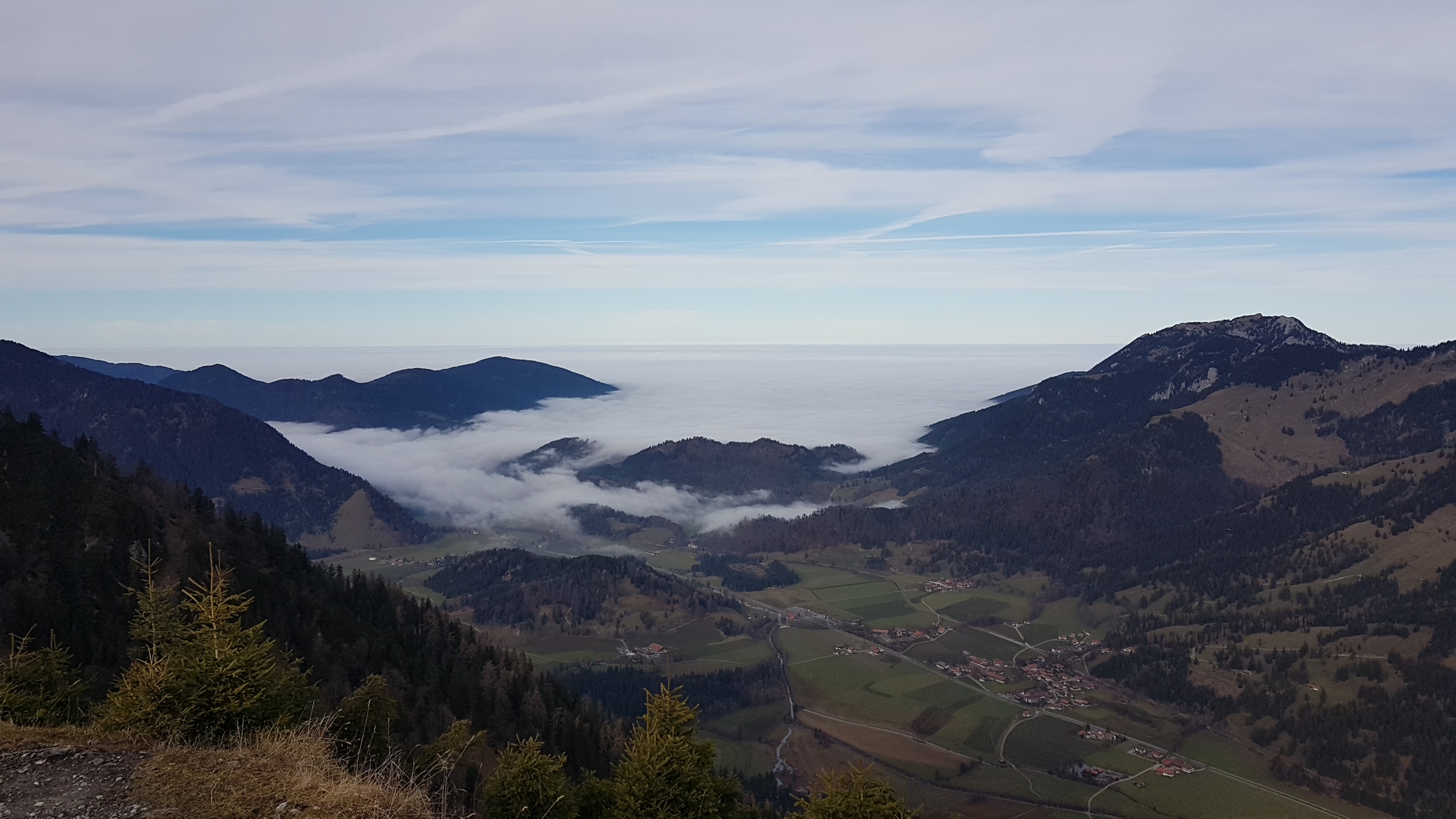 This hike starts at Bayrischzell. It’s the last town you can reach by train. (You can also start in Geitau, walk in opposite direction, and don’t close the loop.) Directly from the parking for the Seeberg trail, the hike starts to climb. It’s not too steep, but keeps on climbing for the next five kilometers. However, with a clear sky, the views are awesome. For me, they extended to the already snow-covered peaks Southeast of the Inn valley in Austria. To the other side, I saw fog creeping into the valley at which I started. And indeed: when I reached the valley again, fog had covered all of it. It was a near-mystic change of scenery and atmosphere.