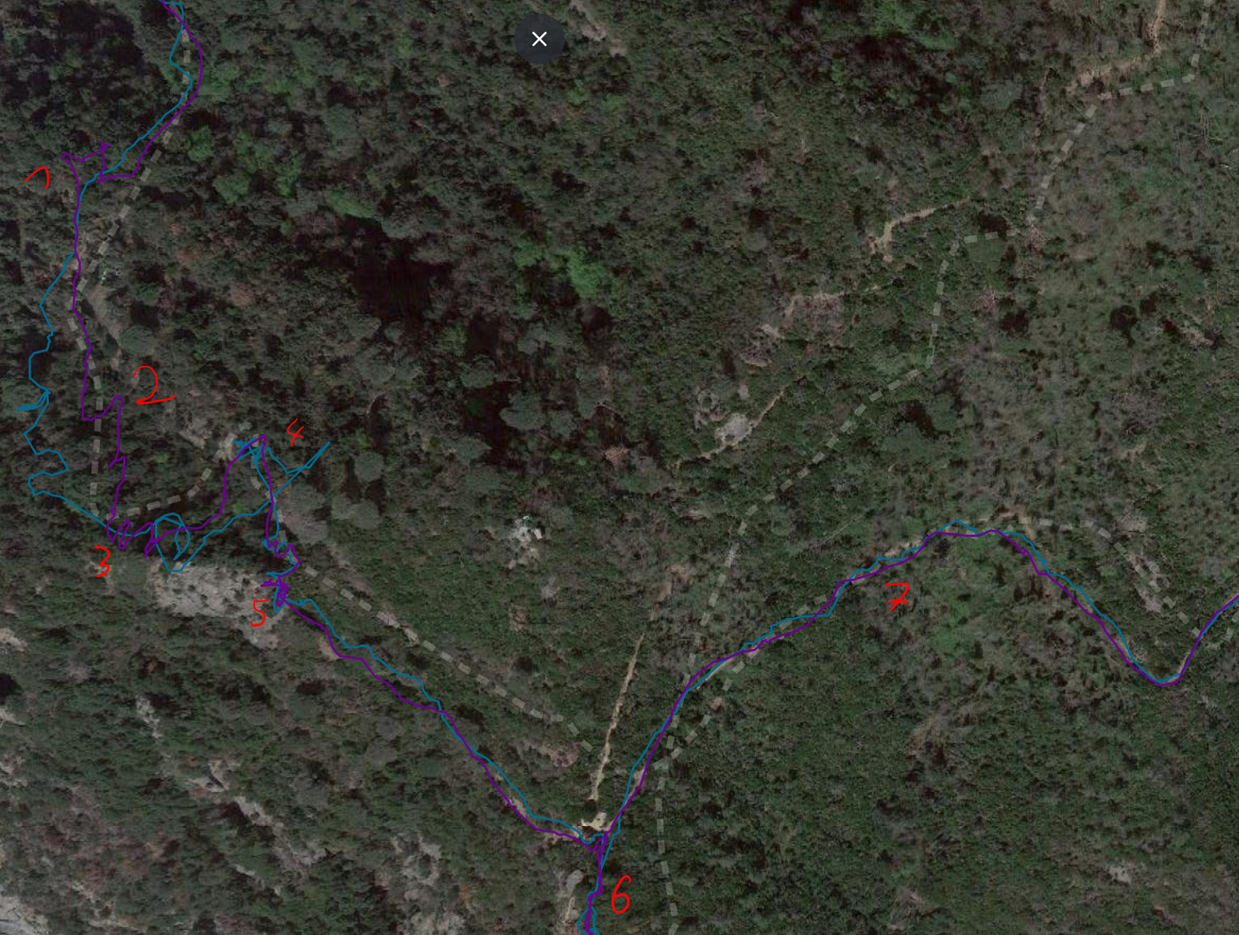 With the next image, I zoom in on point (1). I highlight this section because it was the most challenging part of the hike: I was climbing up through the forest over a number of narrow switchbacks.