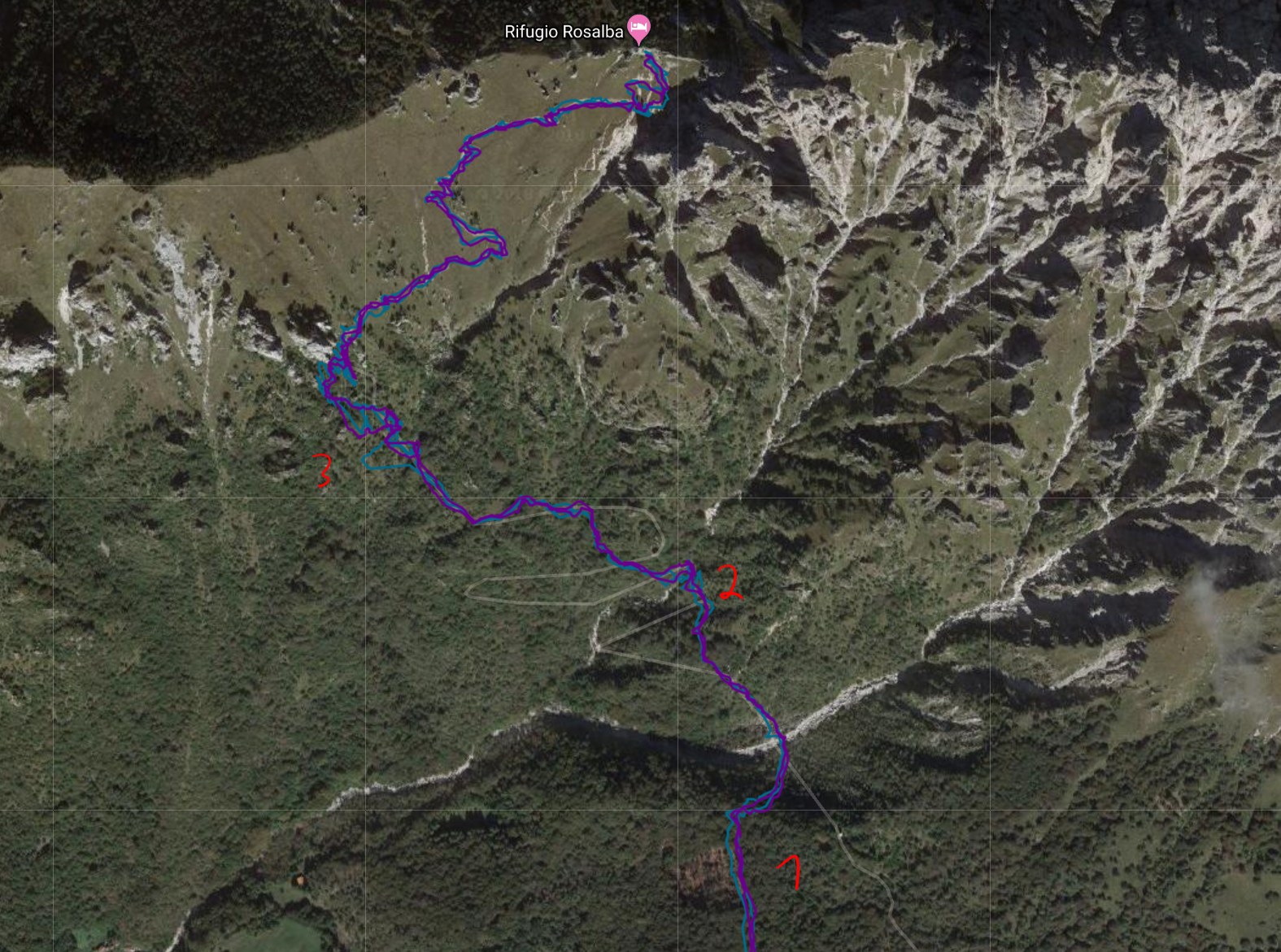 Most of the track looks as neat as the section next to point (1). If you look at it closely, the FR 935 (now purple) performs marginally better (way up and way down are more often parallel to each other). There are some deviations between way up and way down in the area without trees (in the upper part of the picture). That’s correct. The path split up a few times.