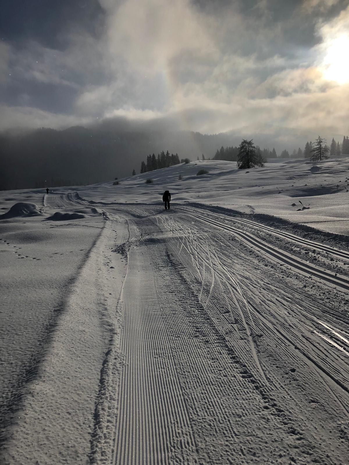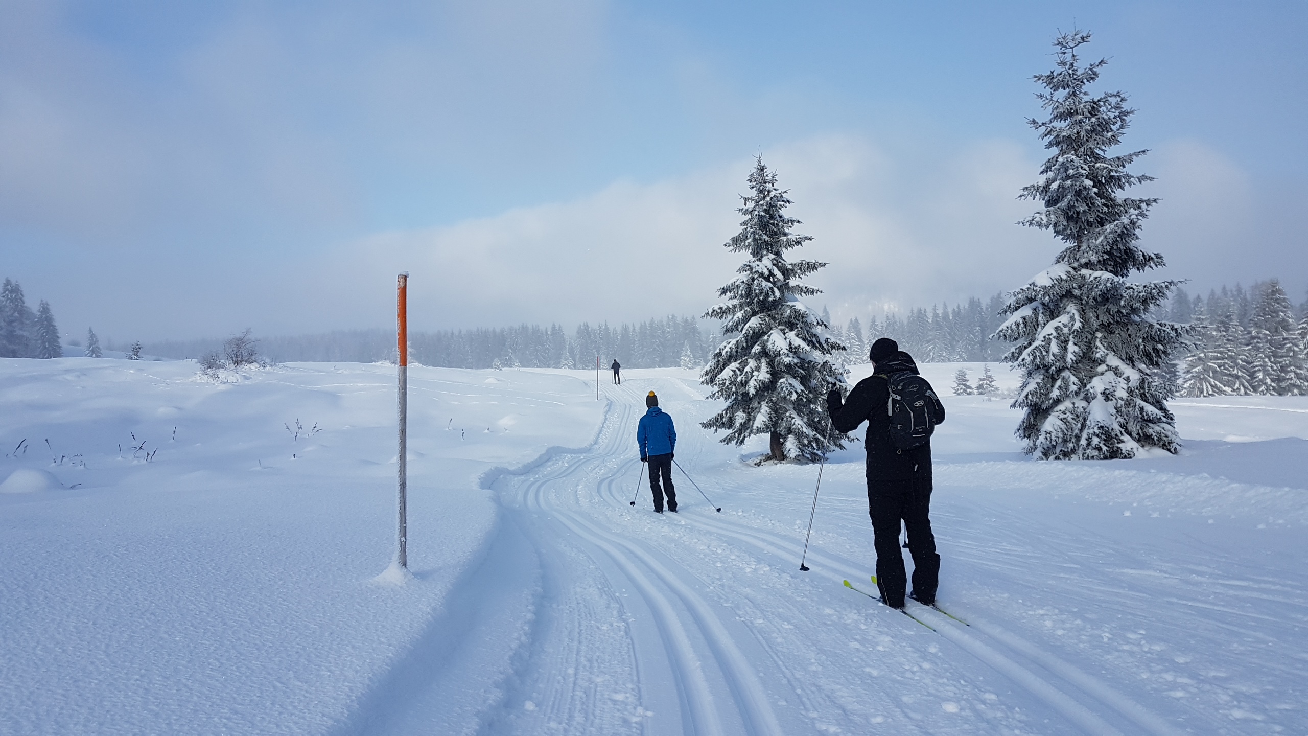 The trail sort of starts at the Hindenburghütte. The first 300m is a steep climb. Many less advanced skiers prefer to walk up their ski to avoid the effort. Going down this very slope at the end of the trail, you should know how to steer. This is by far the most challenging bit of this trail. At the end of this little climb, there’s a little crossing. A winter hike starts here. Straight ahead, the trail continues, while it returns from the left. Formally, it’s a one-way loop, so please go straight and run it counter-clockwise.